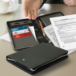 Zippered closure. Interior organiser with gusseted file pocket, business cards, calculator & front pockets.