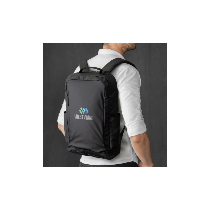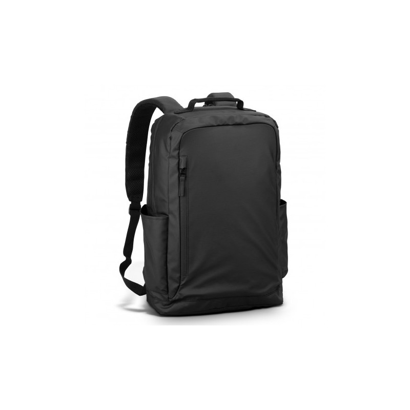 Robust backpack which is manufactured from 600D polyester. It has a main zippered compartment with an internal laptop sleeve and two zippered external pockets on the front. Other features include a padded back, adjustable woven shoulder straps, a woven carry handle, two mesh side pockets and woven zipper pulls.