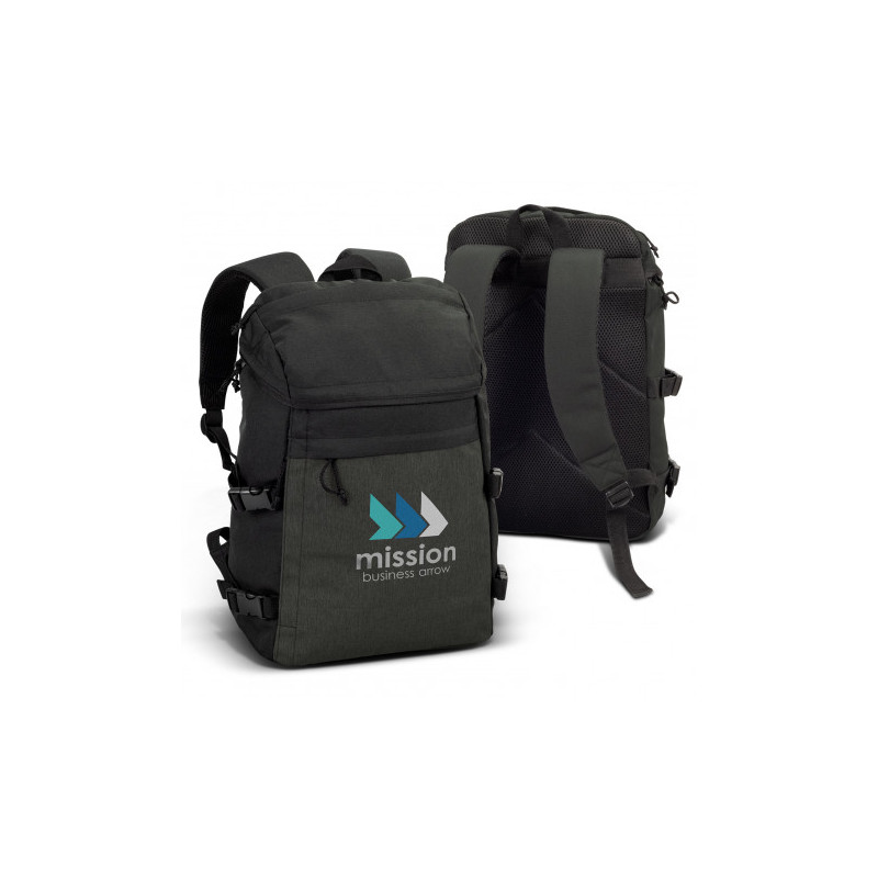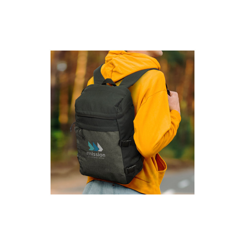 Sophisticated backpack which is manufactured from a combination of on-trend heather style 300D polyester and 600D polyester. It has a distinctive front pocket with an eye-catching patterned finish which has two internal slip pockets with pen holders and a zippered closure. Velocity has a large zippered main compartment with a padded laptop sleeve. Other...