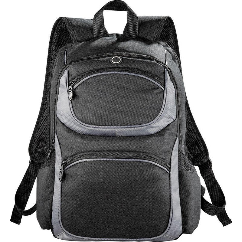Robust backpack which is manufactured from 600D polyester. It has a main zippered compartment with an internal laptop sleeve and two zippered external pockets on the front. Other features include a padded back, adjustable woven shoulder straps, a woven carry handle, two mesh side pockets and woven zipper pulls.