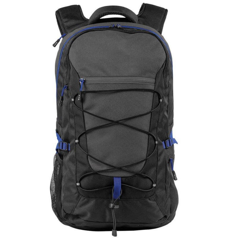 Robust backpack which is manufactured from 600D polyester. It has a main zippered compartment with an internal laptop sleeve and two zippered external pockets on the front. Other features include a padded back, adjustable woven shoulder straps, a woven carry handle, two mesh side pockets and woven zipper pulls.