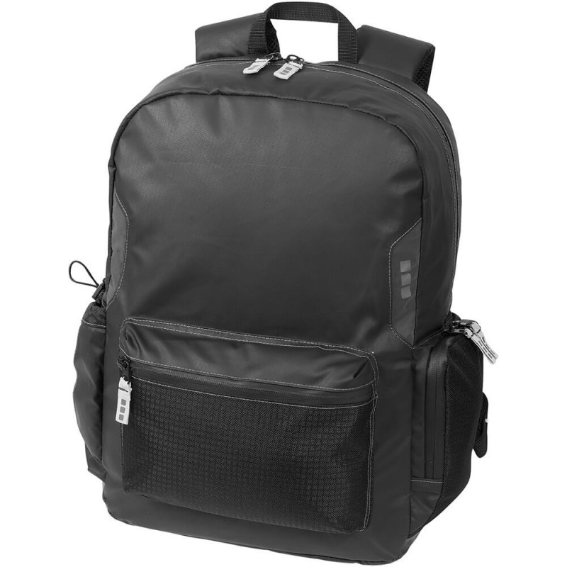 Robust backpack which is manufactured from 600D polyester. It has a main zippered compartment with an internal laptop sleeve and two zippered external pockets on the front. Other features include a padded back, adjustable woven shoulder straps, a woven carry handle, two mesh side pockets and woven zipper pulls.