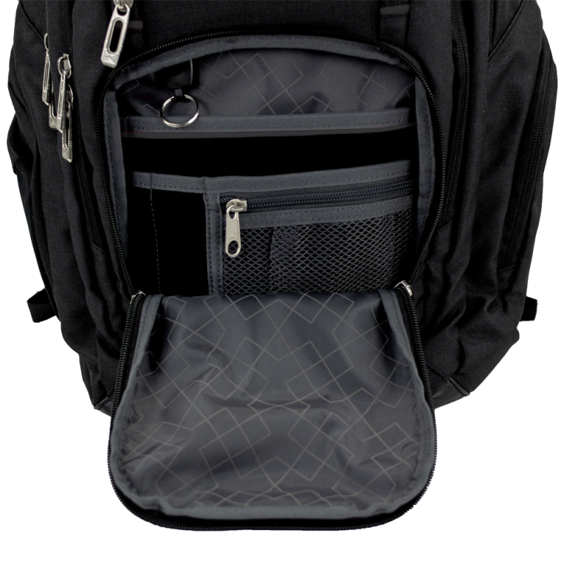 Laptop-only section unfolds lying flat on X-ray belt expediting airport security. Holds most 15 inch laptops with zippered main compartment and front pocket containing deluxe organisation panel and key ring. It also features a zippered top pocket with organisation and earbud port, side pockets, adjustable padded shoulder straps and carry handle.