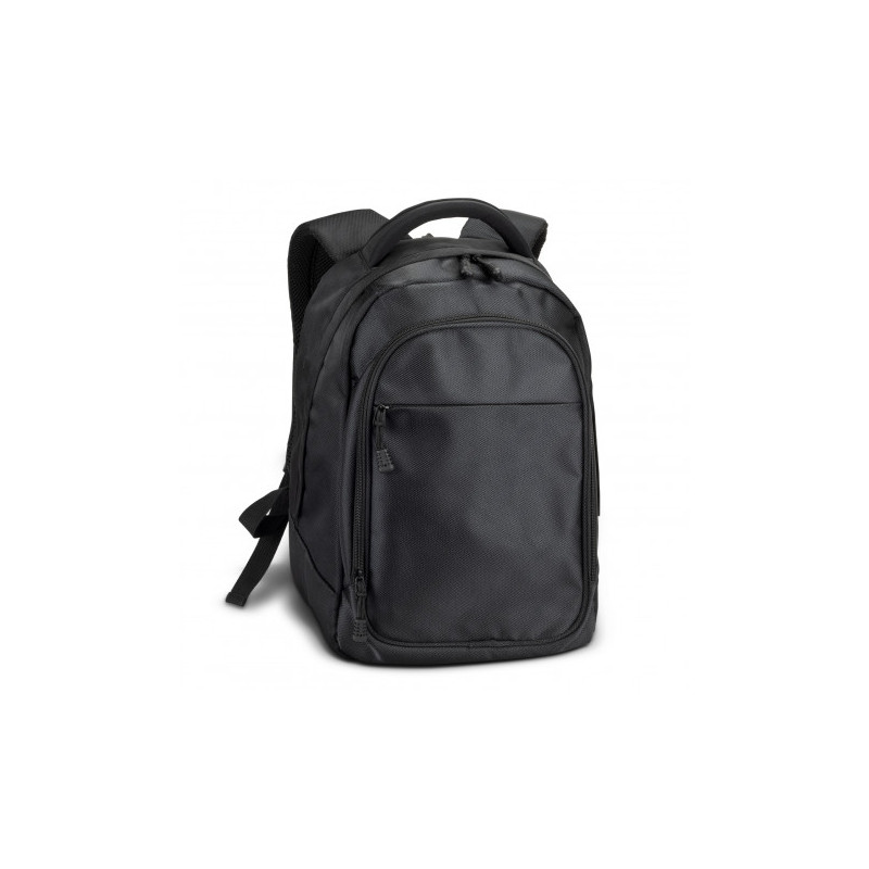 Robust backpack which is manufactured from 600D polyester. It has a main zippered compartment with an internal laptop sleeve and two zippered external pockets on the front. Other features include a padded back, adjustable woven shoulder straps, a woven carry handle, two mesh side pockets and woven zipper pulls.