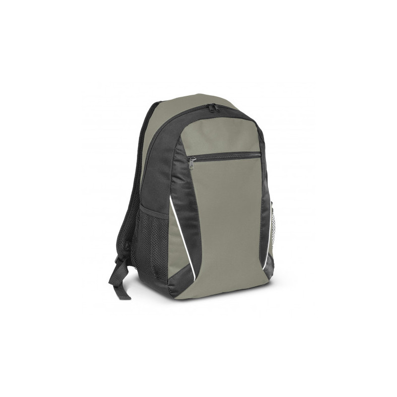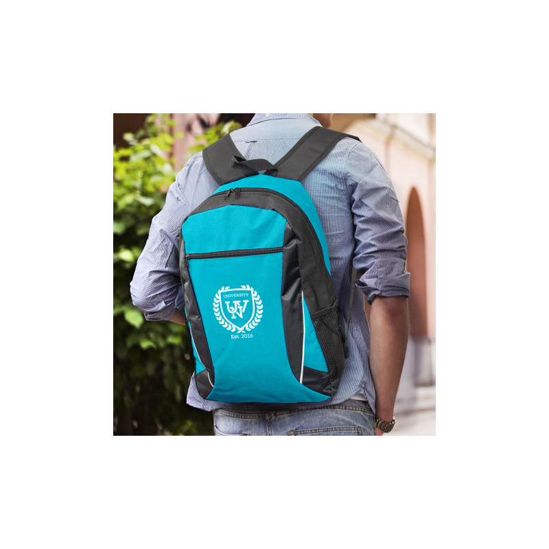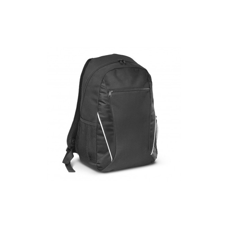 Affordable backpack which is manufactured from 600D polyester. It has a zippered main closure and adjustable woven shoulder straps with padding. Other features include a large zippered front pocket, a woven carry handle and a mesh drink bottle holder.