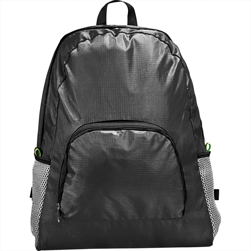 Large single compartment backpack with trendy white piping which is manufactured from 600D polyester. It has a padded back for comfortable carrying, padded woven shoulder straps which are adjustable, a zippered front pocket and two mesh side pockets.