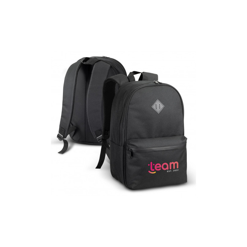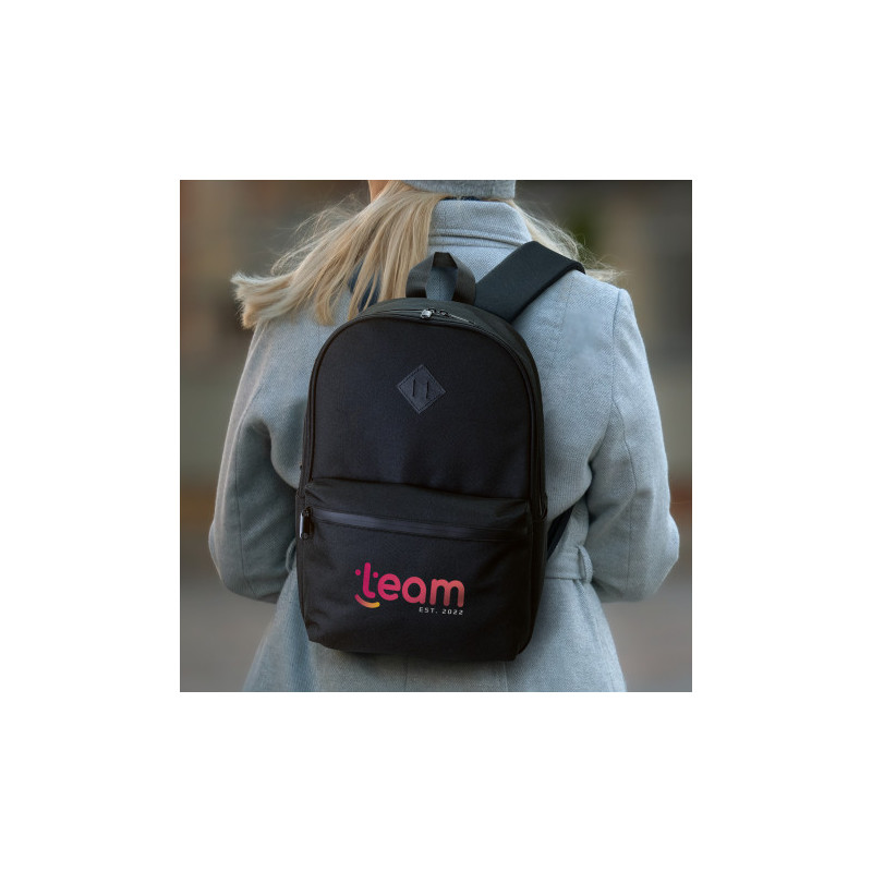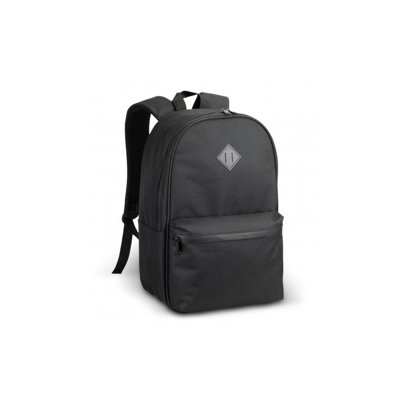 Robust backpack which is manufactured from 600D polyester. It has a main zippered compartment with an internal laptop sleeve and two zippered external pockets on the front. Other features include a padded back, adjustable woven shoulder straps, a woven carry handle, two mesh side pockets and woven zipper pulls.