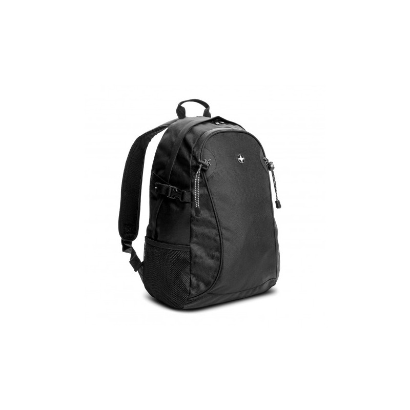 Robust backpack which is manufactured from 600D polyester. It has a main zippered compartment with an internal laptop sleeve and two zippered external pockets on the front. Other features include a padded back, adjustable woven shoulder straps, a woven carry handle, two mesh side pockets and woven zipper pulls.