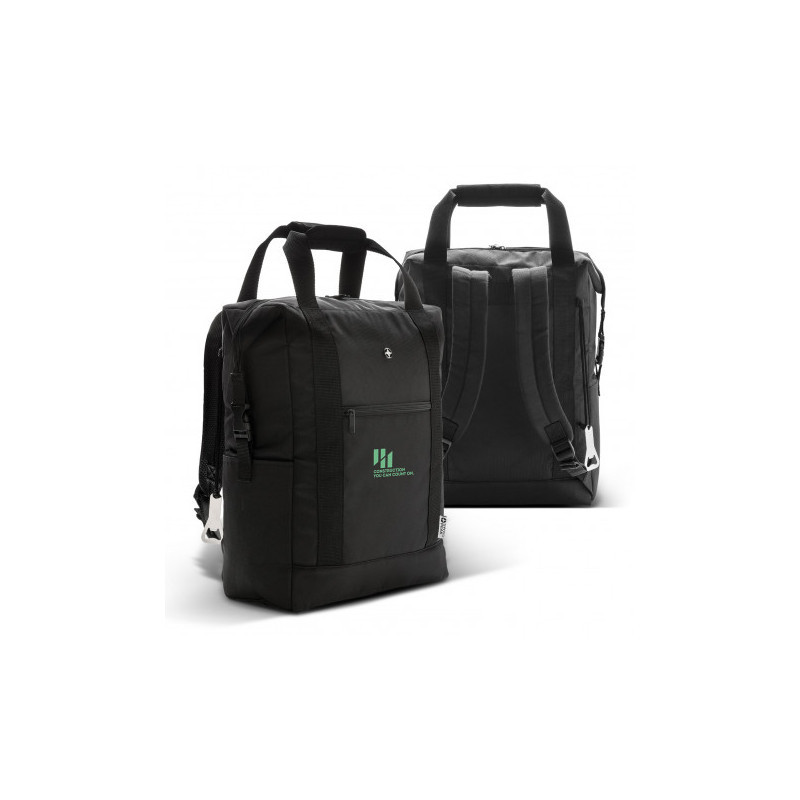 Large backpack which is manufactured from smart 300D polyester with a padded 600D polyester back panel for comfortable carrying. It has 210D polyester lining and a roll top closure with a secure snap lock. Other features include an internal slip pocket that fits a 17 inch laptop or a tablet, a large zippered external pocket, two mesh side pockets, a carry...