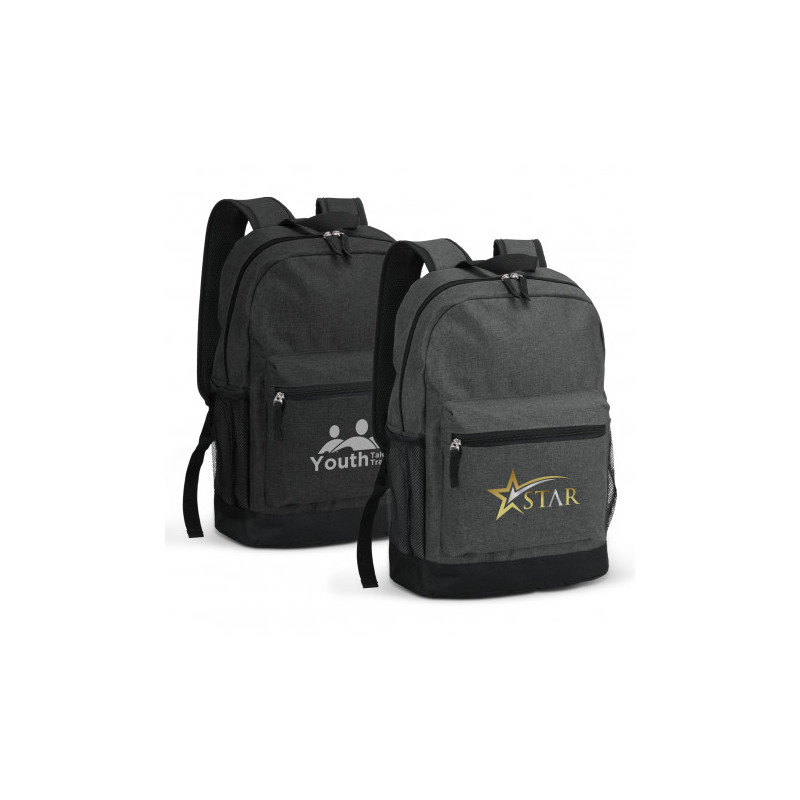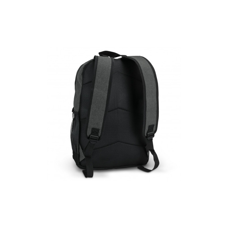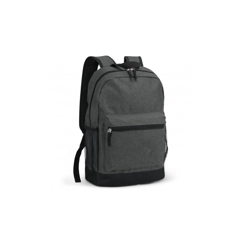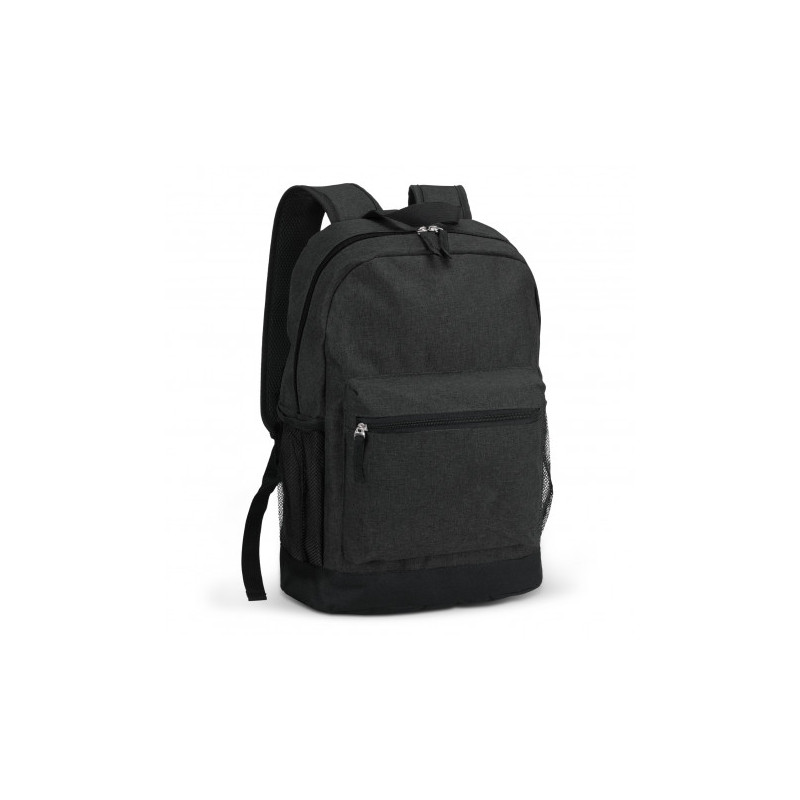 Affordable backpack which is manufactured from 600D polyester. It has a zippered main closure and adjustable woven shoulder straps with padding. Other features include a large zippered front pocket, a woven carry handle and a mesh drink bottle holder.