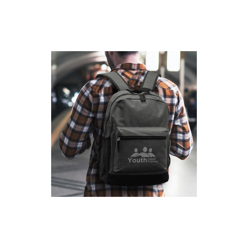 Robust backpack which is manufactured from 600D polyester. It has a main zippered compartment with an internal laptop sleeve and two zippered external pockets on the front. Other features include a padded back, adjustable woven shoulder straps, a woven carry handle, two mesh side pockets and woven zipper pulls.