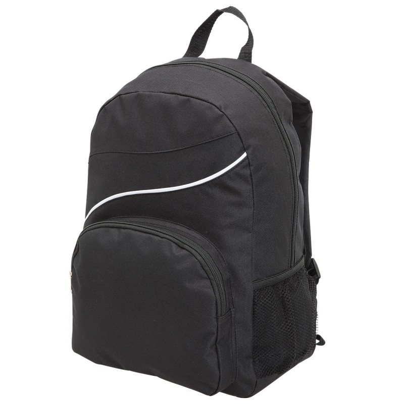 Large single compartment backpack with trendy white piping which is manufactured from 600D polyester. It has a padded back for comfortable carrying, padded woven shoulder straps which are adjustable, a zippered front pocket and two mesh side pockets.