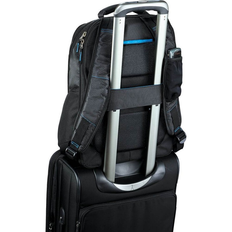 Laptop-only section unfolds lying flat on X-ray belt expediting airport security. Holds most 15 inch laptops with zippered main compartment and front pocket containing deluxe organisation panel and key ring. It also features a zippered top pocket with organisation and earbud port, side pockets, adjustable padded shoulder straps and carry handle.