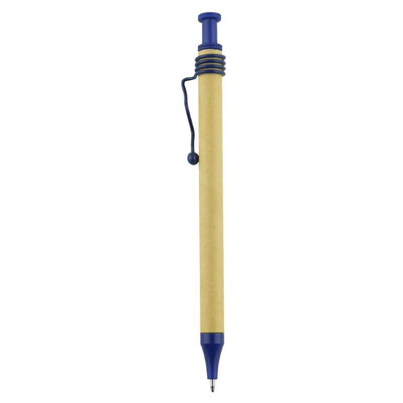 Environmentally-conscious ballpoint pen with a kraft paper barrel and removable lid. It has a blue refill with 500 metres of ink.