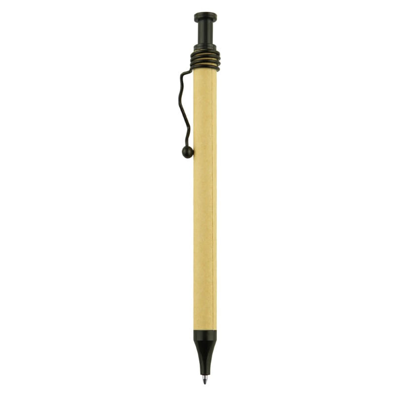 Environmentally-conscious retractable ball pen with a kraft paper barrel and a trim manufactured from a blend of wheat straw and ABS. It has a blue refill with 1000m of German manufactured Dokumental ink and a tungsten carbide ball for improved writing quality.