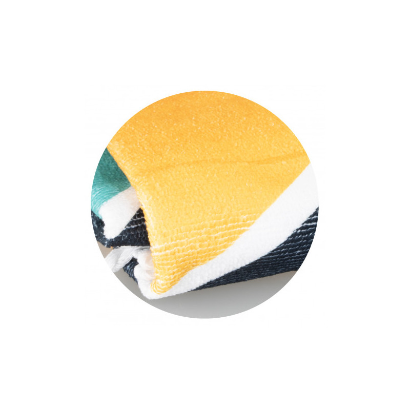 Vibrant beach towel with stunning edge-to-edge full colour sublimation print. This 1500mm round beach towel has a soft 190gsm polyester crystal fleece surface and an absorbent 230gsm cotton terry towel backing, with overlocked edges for added durability.