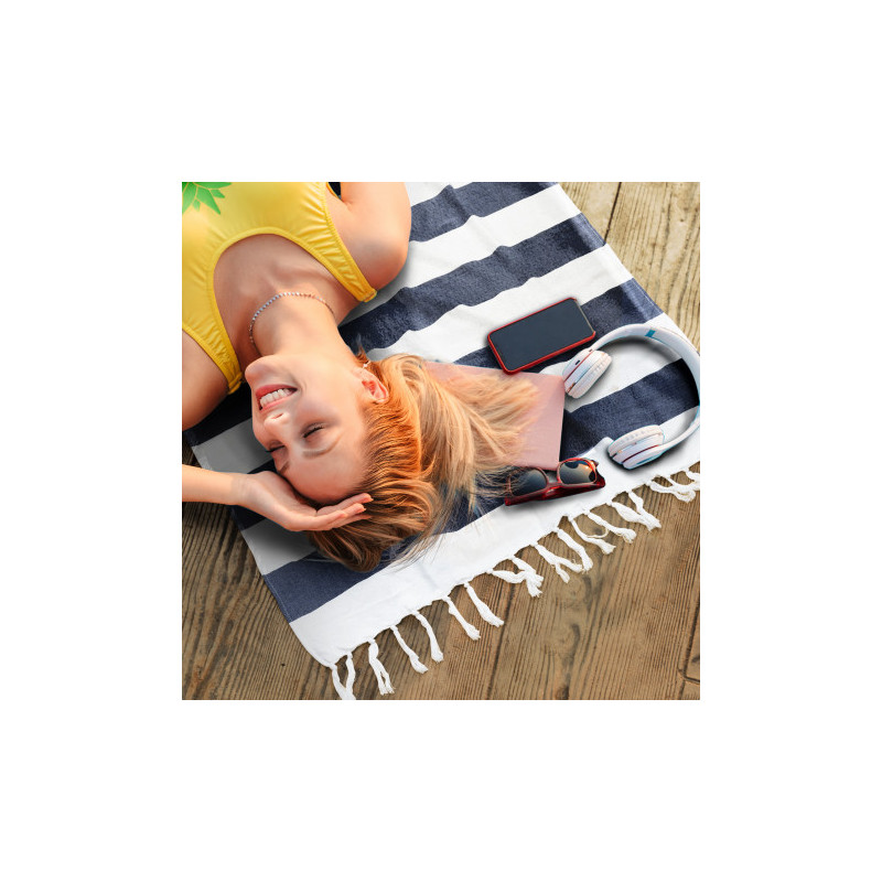 The perfect beach companion, this sand-repellent beach towel is made from a soft 320gsm blend of 85% RPET and 15% polyamide, with a waffle texture which increases absorbency, helps to prevent sand sticking to the towel, and reduces drying time. The towel measures 1570mm x 770mm and can be branded with stunning full colour sublimation print.