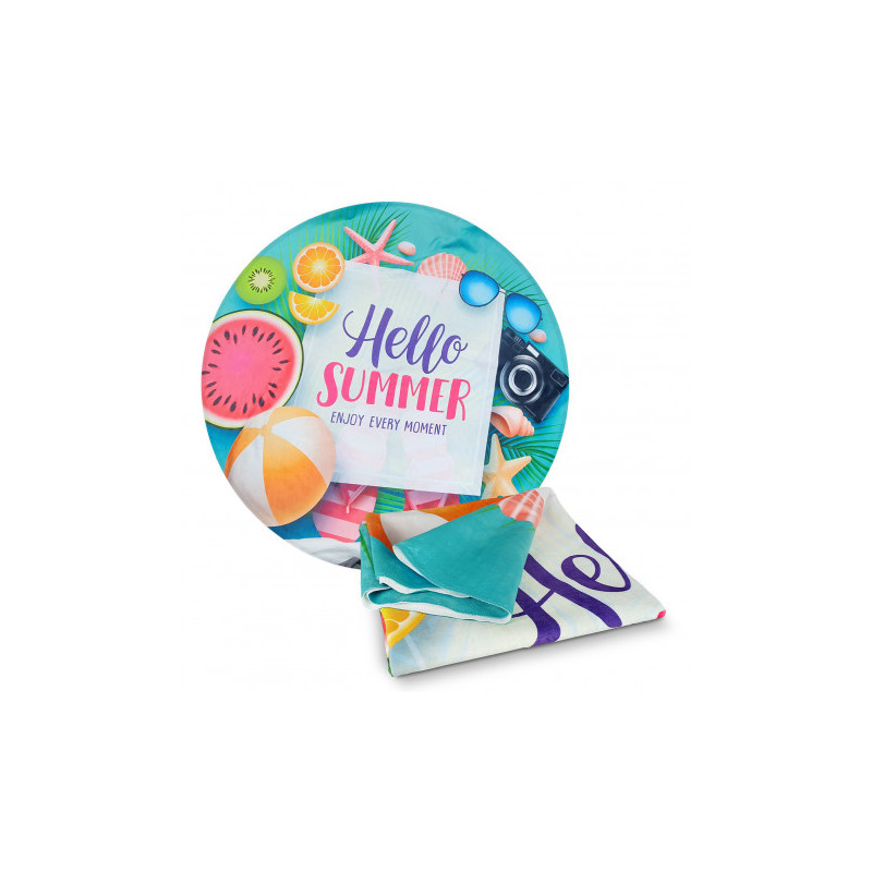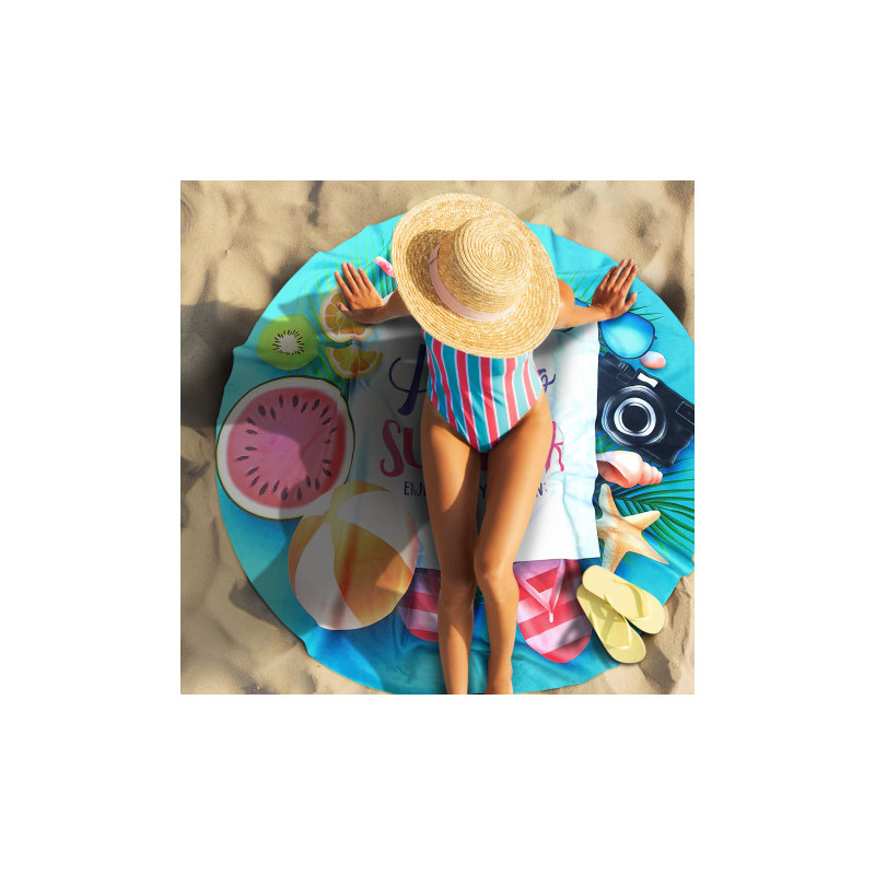 Trendy 150cm round beach towel which is manufactured from fast-drying 240gsm polyester with optional white or black tassels. It can be branded on one side with edge-to-edge full colour print and there is a choice of eight overlocking thread colours. A production lead time of 30 working days applies to this product by air freight and larger orders can be...