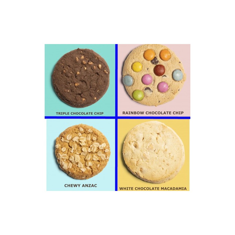 Available Colours: Branded Bag With Sticker. Select From The Following Biscuit/Cookies: Rainbow Chocolate Chip / Chewy Anzac / Triple Chocolate Chip / White Chocolate Macadamia