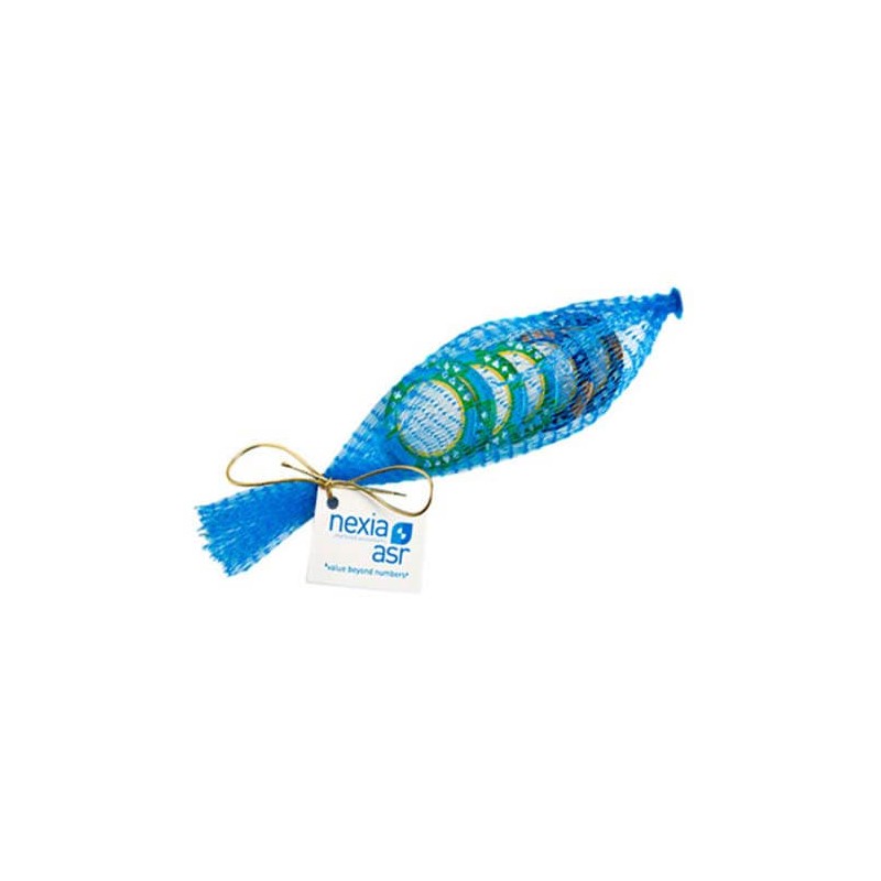 Available Colours: Branded Mesh Bag With Tag. Mesh Bag Colour Options: Blue, Red, Yellow. Mesh Bag Tied With Gold Elastic Ribbon