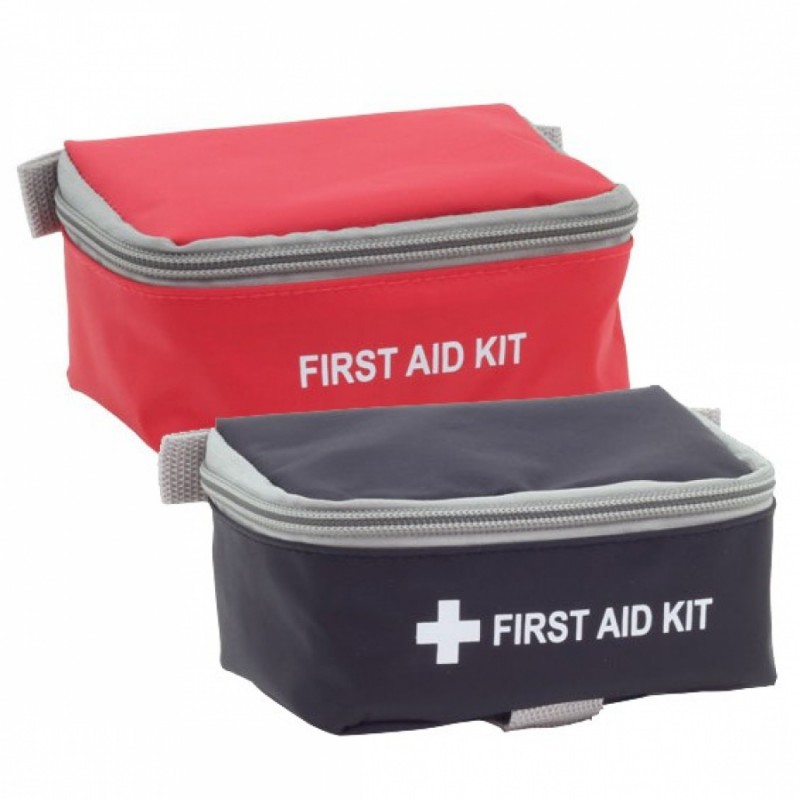 First aid kit includes 5 adhesive bandages, 4 alcohol pads, paper tape roll, 2 safety pins, 5 gauze pads, 1 gauze roll, 1 triangular bandage and scissors in case. --Undecorated Stock Available in 5 Working Days--