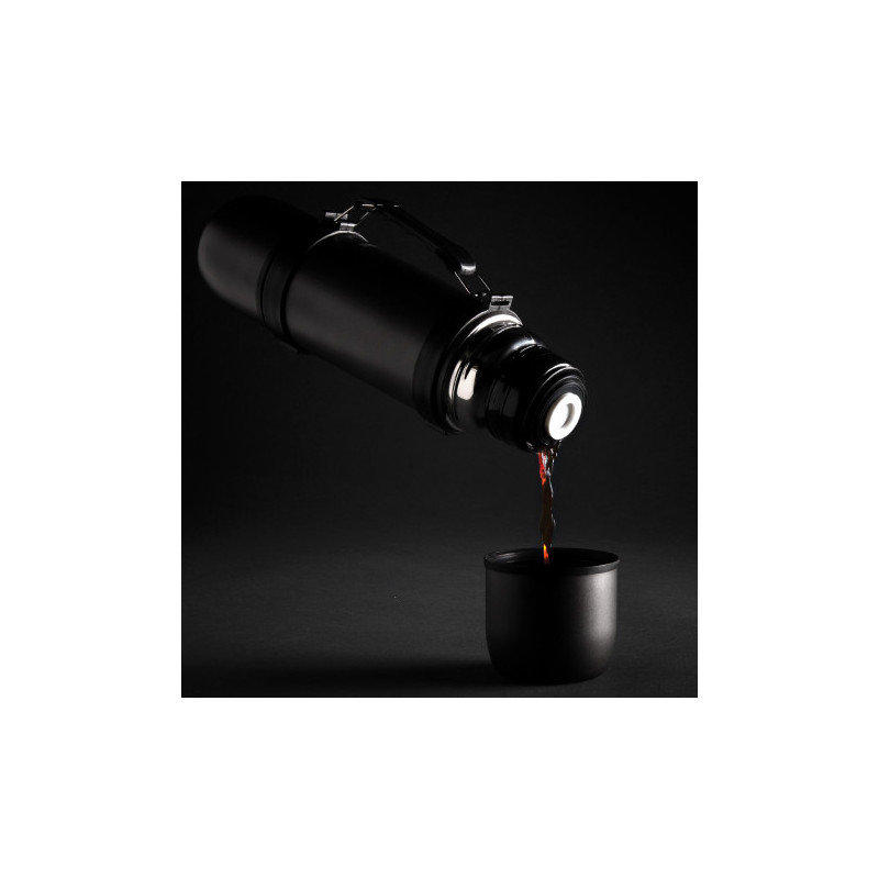 Functional 1L stainless steel, double-wall vacuum flask that keeps drinks cold for 24 hours or hot for up to 12 hours. Fitted with a black carry handle for easy transportation and a screw-on cup. The flask engraves to a natural etch and is BPA-free. This product is not dishwasher safe, and handwashing is recommended.