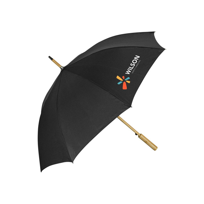 Classic-styled folding umbrella with engraved wooden handle and auto open function.