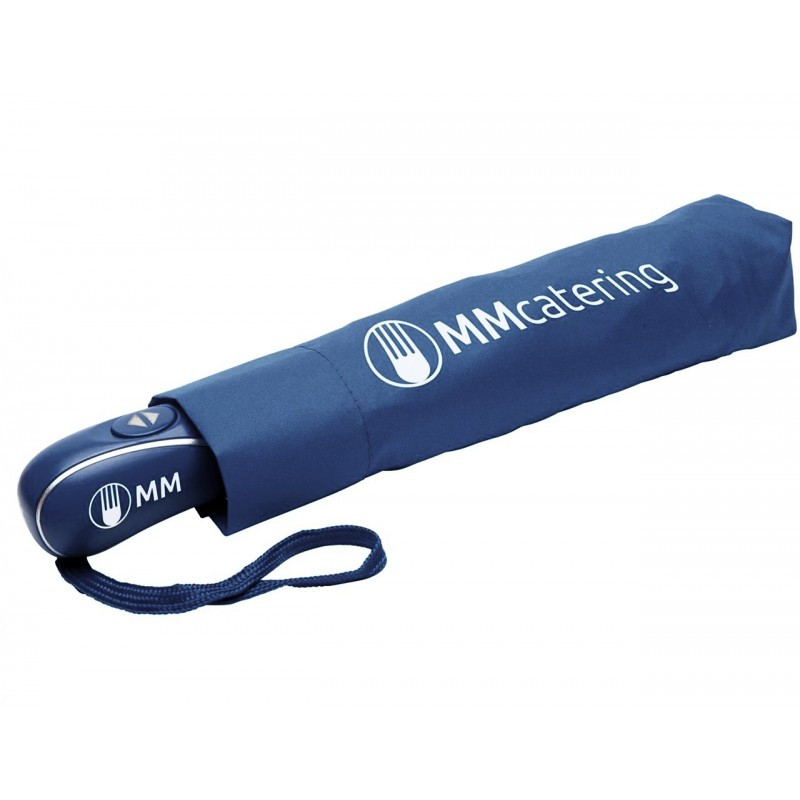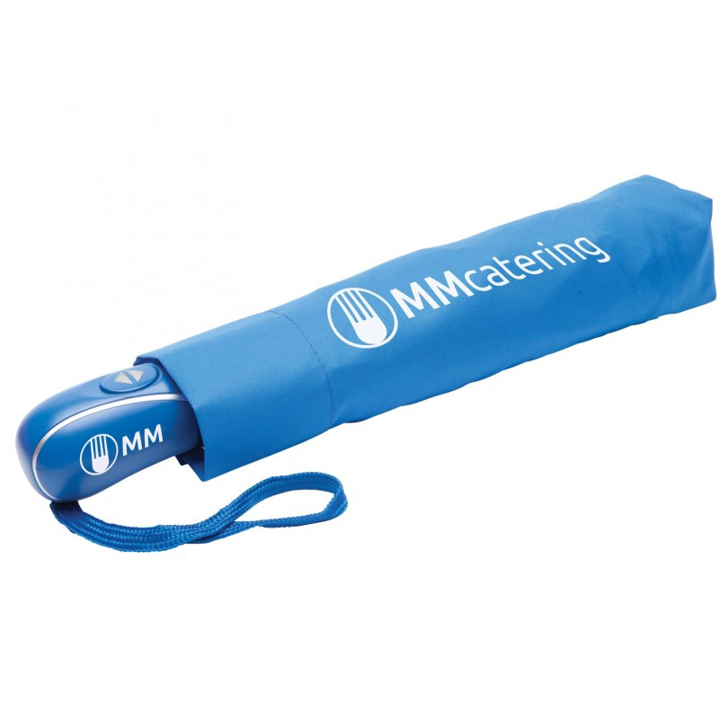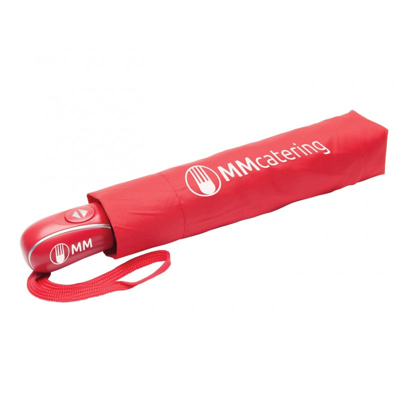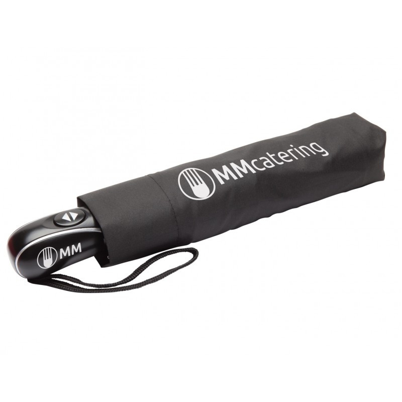 Straight-handled folding umbrella with auto open. Fits easily into a briefcase or laptop bag.