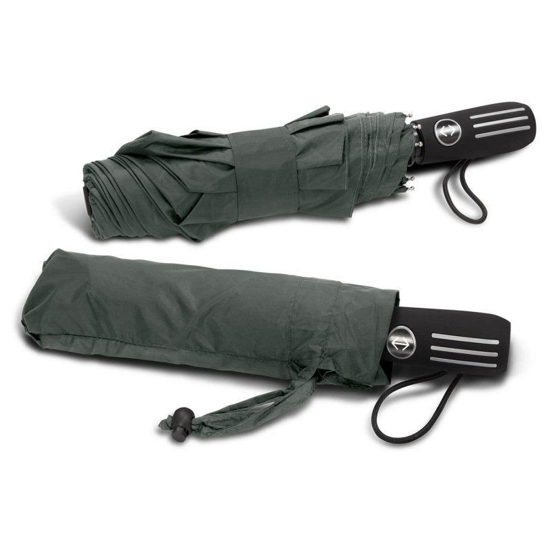 Straight-handled folding umbrella with auto open. Fits easily into a briefcase or laptop bag.