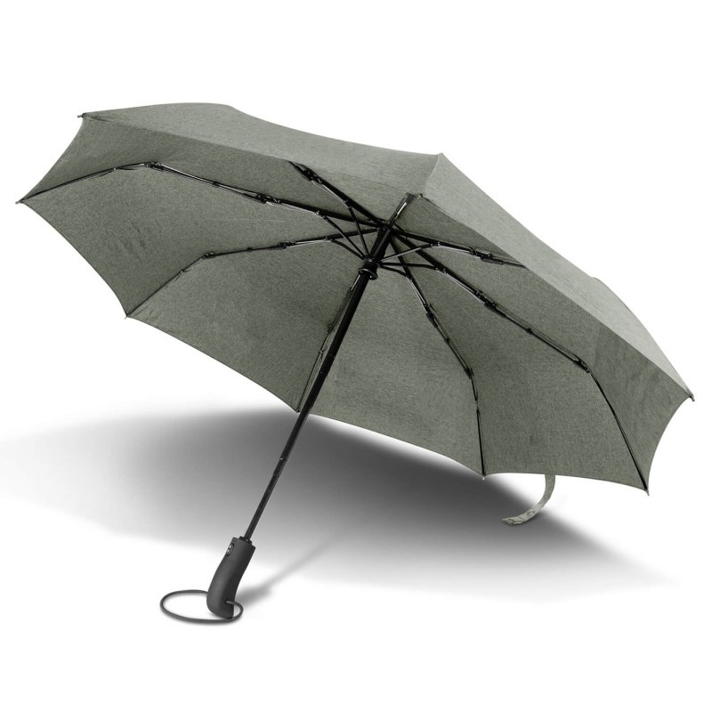 The tri-folding Director Umbrella sports a generous canopy while folding down to a compact 33cm. It has an eight-panel vented pongee canopy with 57cm fibreglass ribs and a steel shaft. Other features include automatic opening and closing, a woven carry handle and a matching pongee drawstring sleeve.