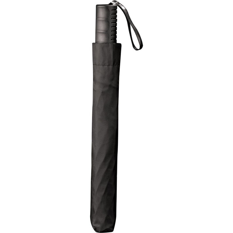 Automatic opening vented folding umbrella. Large vented pongee canopy with matching colour case which includes a shoulder strap. Available in 3 colours.