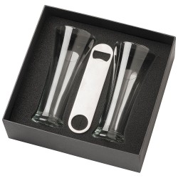 Two piece Pilsner glass set with opener. Supplied in a classy two part black gift box with foam insert. 350ml capacity