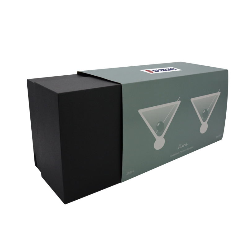Premium 300ml borosilicate glass with a unique can-shaped silhouette for easy grip. Presented in a natural gift box with a branded black sleeve.