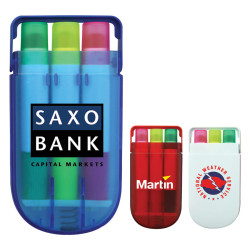 A set of 3 gel highlighters in a carrying case. The tip is formulated from a special gel so they will not smudge or dry out like other highlighters. This gives them an extremely long shelf life.