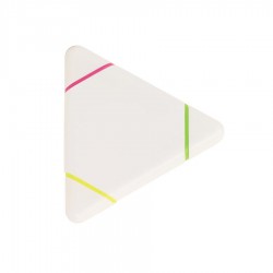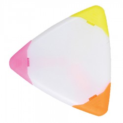 White triangular case features 3 chisel edge fluorescent highlighter markers in green, pink and yellow.