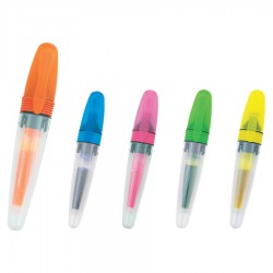 Liquid filled highlighter with airlock valve to stop it drying up. Simply push the tip down to let the ink flow.