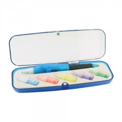 Clear case with three mini wax highlight markers. Superior shelf life to traditional highlight markers - leave the lid off and they still work. Pink, Yellow and Green highlight markers with white barrel and matching transparent lids.