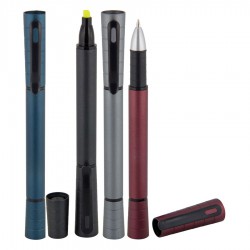 Twist action pen and screw top highlighter with wide silver barrel and black rubber grip. Black German ink refill with 2,000m writing distance.