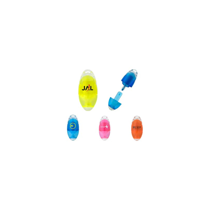 Spinner tri colour highlight marker. White body with 3 chisel tip highlight markers. Yellow, Pink, Blue with matching coloured click in caps. Steel bearings for fast spinning action. Centre is printed with your logo on one side of the highlight marker.