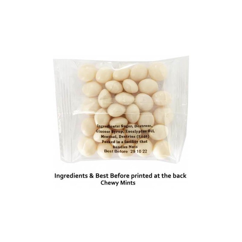 Silver Zip Lock Bag With Mints Or Chewy Mints 50G_x000D_ ingredient info: On Each Item_x000D_ Packaging: Confectionery Placed Directly into Silver Zip Lock Bag