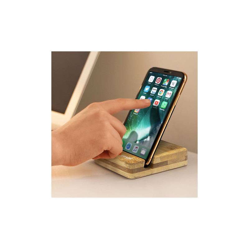 Bamboo Phone holder which sticks onto the back of any mobile phone and provides grip for using the device. It is manufactured from plastic and bamboo. The phone holder also works as a stand, and it will hold a mobile phone in a horizontal position on a surface for easy viewing. Bamboo is a natural material and because the plant is fast growing, it places...