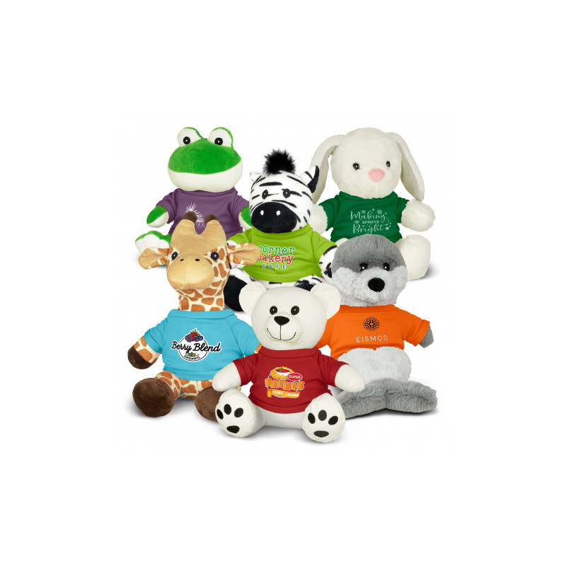 Soft giraffe plush toy with embroidered eyes and a polyester t-shirt which is available in eleven colours. Plush animals provide a cute and cuddly branding option and are great for brand recognition and spreading goodwill.