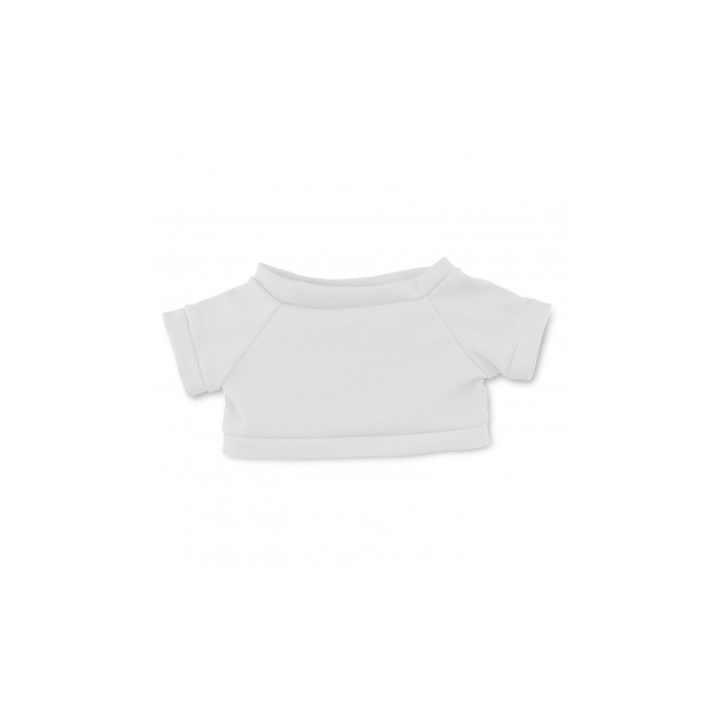 16cmH plush white sitting teddy bear. Embroidered eyes and brown nose. Optional printed velcro polyester T-Shirt available in white, red or blue.