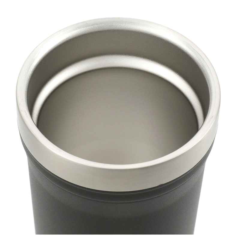375ml 304 grade stainless steel mug, BPA free double wall with a push-seal plastic lid keeps drinks hot for longer, black matt finishing engraves to a silver steel colour.