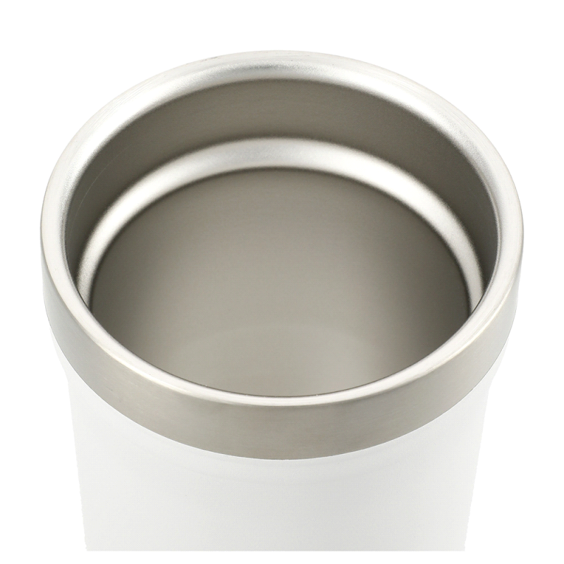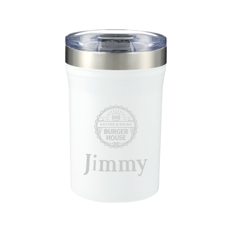 375ml 304 grade stainless steel mug, BPA free double wall with a push-seal plastic lid keeps drinks hot for longer, brush finishing engraves to a natural etch.