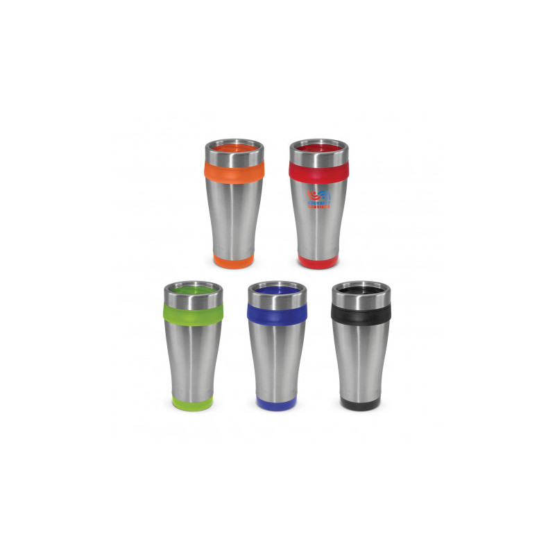 Stylish reusable takeaway cup fitted with mix and match silicone bands and lids to match with your corporate colours. 12 band and lid colours. Alternate hard lid with star closure available.