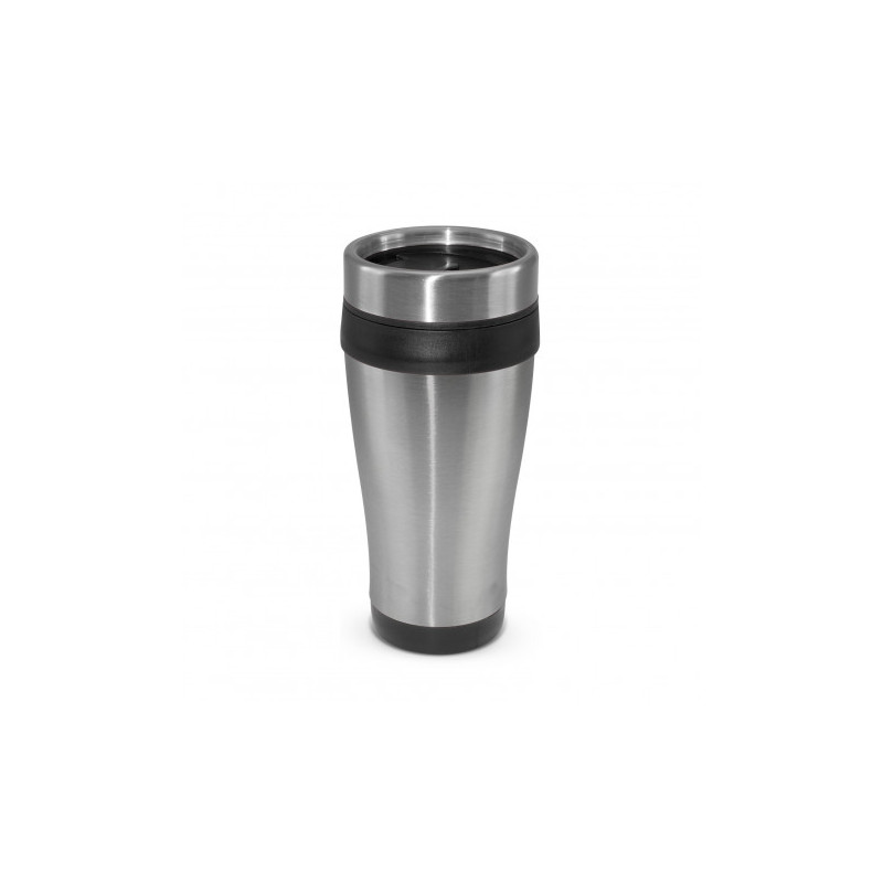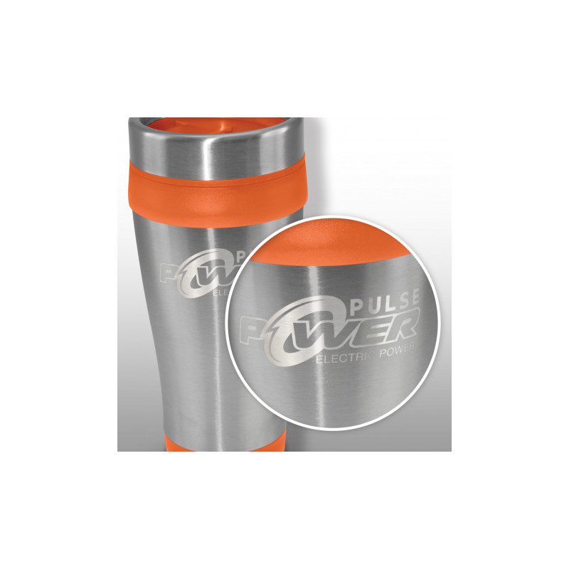 375ml 304 grade stainless steel mug, BPA free double wall with a push-seal plastic lid keeps drinks hot for longer, brush finishing engraves to a natural etch.