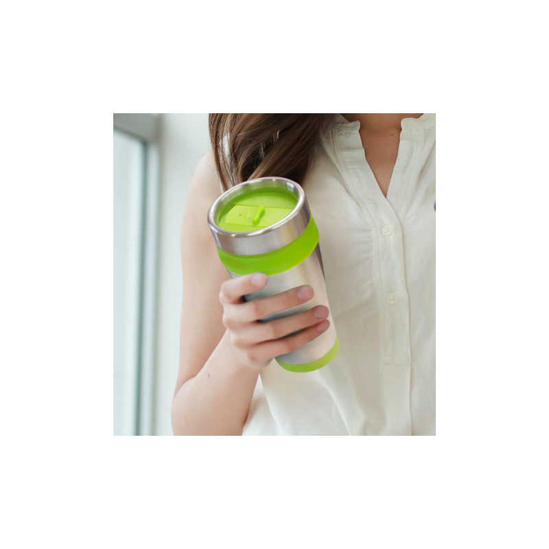 400ml double wall travel mug, a special curved design with outer wall constructed by a conbination of plastic and brushed stainless steel, 304 grade stainless steel inner wall, plastic lid with splashproof push-seal closure, BPA free and handwashing is recommended.