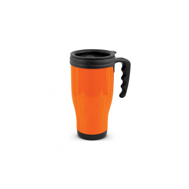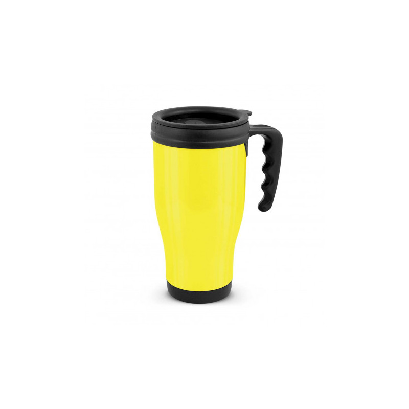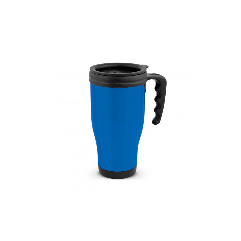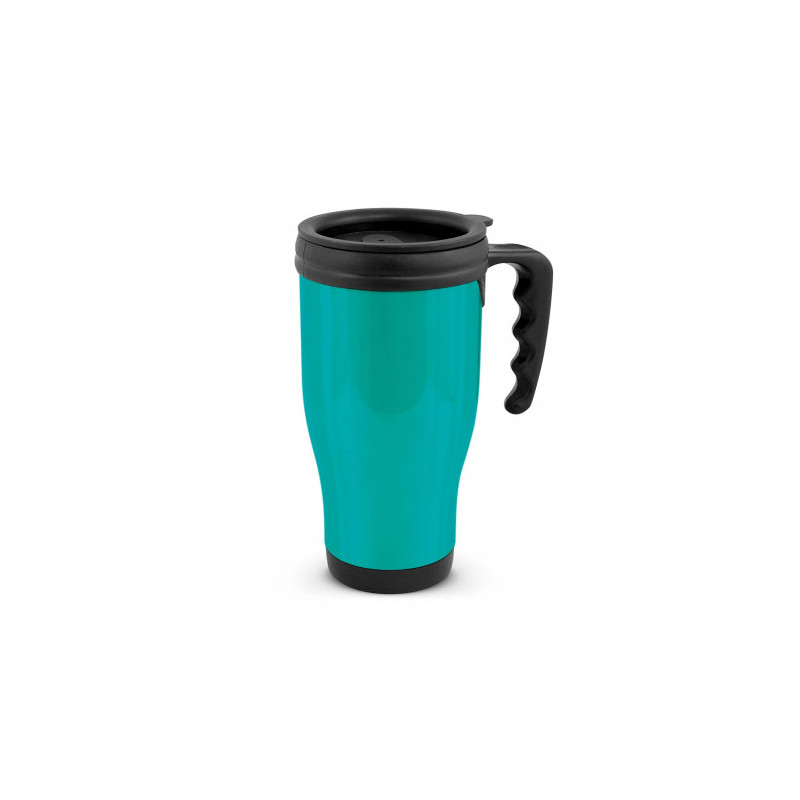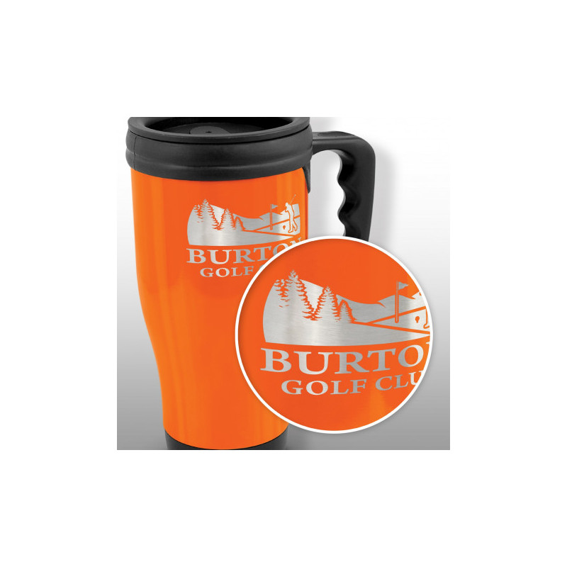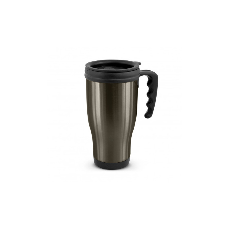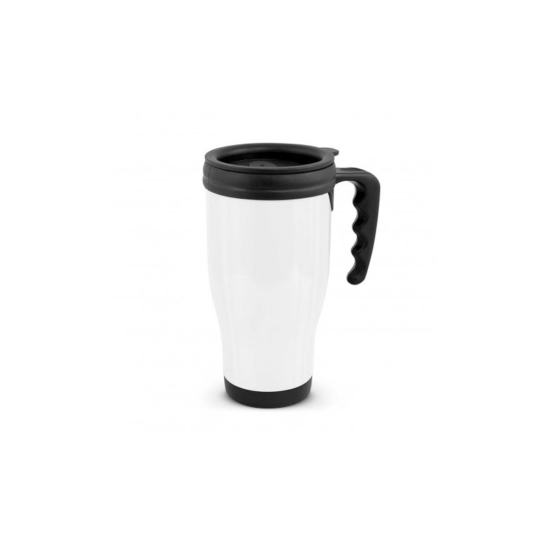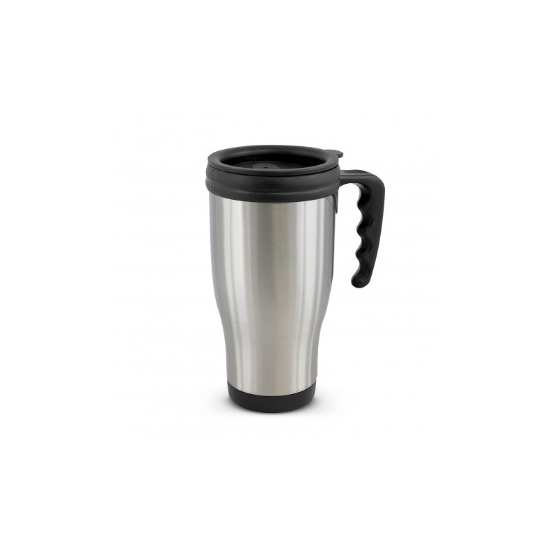 475 ml stainless steel double wall travel mug, with a BPA free plastic handle and a push-seal lid which is splashproof. Laser engraves to a natural etch, the product is not dishwasher safe, hand wash only.