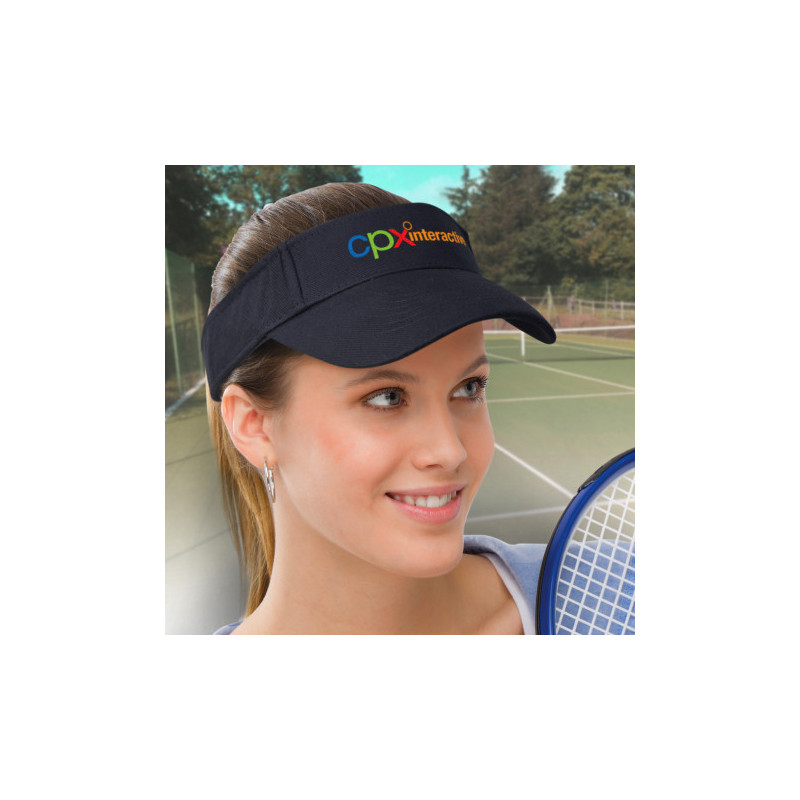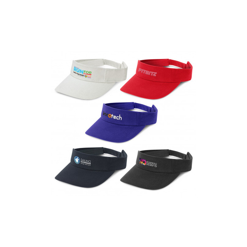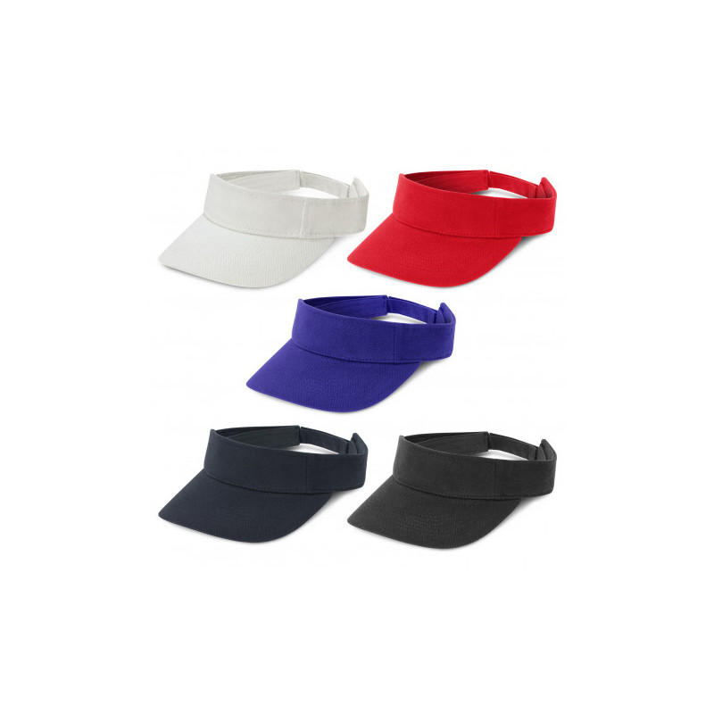 Premium quality polyester mesh sun and sports visor with a pre-curved peak, a sweat band and an adjustable Velcro closure which allows one size to fit most people.